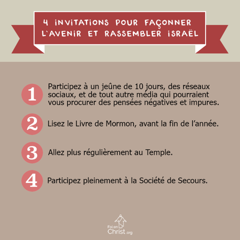 Le Président Nelson n’a pas spécifié de délai pour les 10 jours de jeûne des réseaux sociaux et autres médias qui nous éloignent du Sauveur. Néanmoins, comme son défi de lire le Livre de Mormon est à mettre en pratique avant la fin de l’année 2018, nous pouvons supposer qu’il espère voir les femmes de l’Eglise « jeûner » durant cette même période, à la discrétion de chacune quant à la date de commencement.