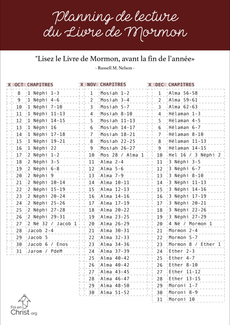 Pour ce qui est de la lecture du Livre de Mormon, voici un exemple de calendrier de lecture que vous pouvez imprimer et utiliser pour votre étude personnelle: