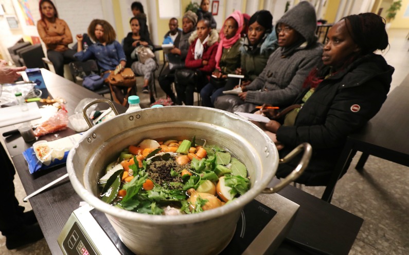 Des réfugiés assistent à un cours de cuisine dispensé par des missionnaires de LDS Charities à l’Église épiscopale Saint-Paul-dans-les-Murs de Rome, le jeudi 7 mars 2019. L’Église de Jésus-Christ des Saints des Derniers Jours collabore avec l’Église Catholique pour aider les réfugiés.