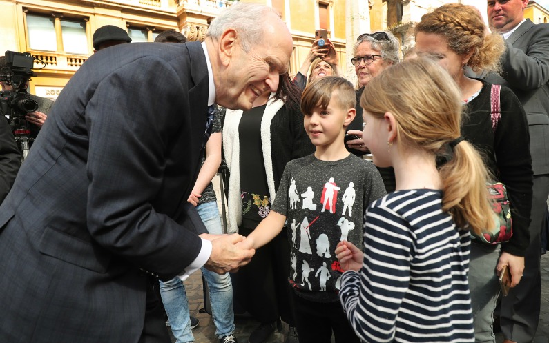 Russell M. Nelson, président de l’Eglise de Jésus-Christ des Saints des Derniers Jours, s’arrête pour parler avec Ammon et Emma Schar, originaires de Basel en Suisse, le samedi 9 mars 2019 à Rome. La famille Schar est à Rome pour la consécration du temple.