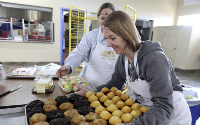 Cherry Leithead, bénévole de l’Église de Jésus-Christ des Saints des Derniers Jours charge un plateau de muffins à la cantine Saint-Vincent-de-Paul de Salt Lake City, le jeudi 7 mars 2019.