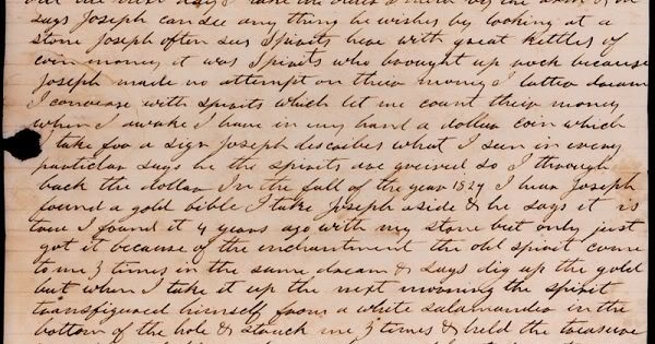 « … J’ai entendu que Joseph a trouvé une bible d’or. J’ai pris Joseph à part et il a dit que c’était vrai. Je l’ai trouvé il y a 4 ans avec ma pierre mais je viens juste de le prendre à cause de l’enchantement. Le vieil esprit est venu à moi 3 fois dans le même rêve et a dit de déterrer l’or mais quand je suis allé le prendre le lendemain l’esprit s’est transformé en une salamandre blanche au fond du trou, m’a frappé trois fois, a retenu le trésor et n’a pas voulu me le donner … »