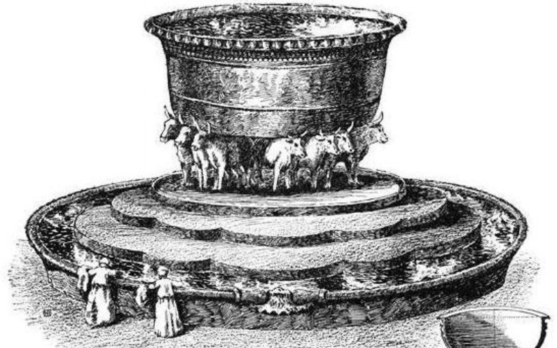 Il fit la mer en métal fondu … Elle était posée sur douze bœufs dont trois tournés vers le nord, trois tournés vers l’occident, trois tournés vers le sud et trois tournés vers l’orient ; la mer était sur eux et toute la partie postérieure de leur corps était à l’intérieur.