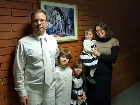 Bon, rien de bien choquant, n’est-ce pas? Le blanc symbolisant la pureté, il est logique que la personne qui va rentrer dans les fonts baptismaux soit habillée de cette couleur. L’officiant est également en blanc (en général un pantalon, une chemise et une cravate blanche). Ci-dessous, ma famille avant le baptême, mon mari et mon fils étant déjà revêtus de leurs habits blancs.