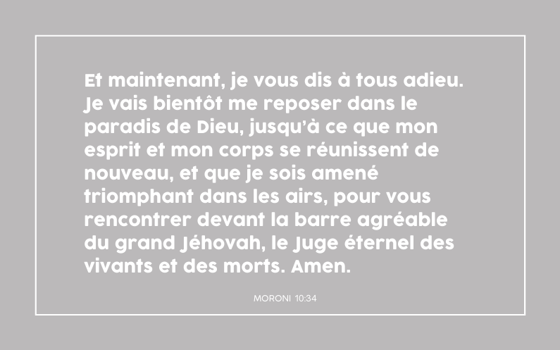Un des hommes les plus remarquables dans les écritures est Moroni. Il a vu son peuple entier se détourner de Dieu. Son père est mort en bataille contre ceux qui cherchaient à le tuer à cause de sa croyance en Dieu. Bien qu’il se soit retrouvé seul croyant dans son continent, il a continué à croire en Dieu. Et il a continué à prêcher l’Évangile par écrit. Il a écrit certains des chapitres du Livre de Mormon les plus inspirants.