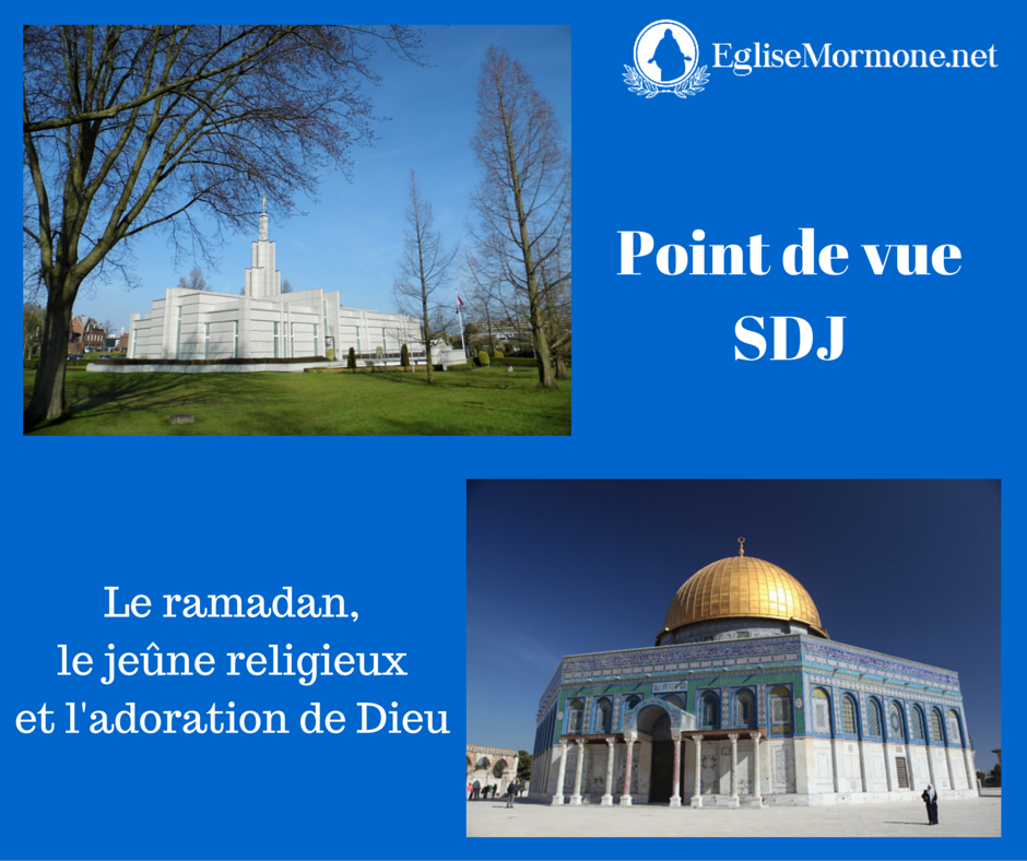 Les principes décrits jusqu’ici de ce culte, la prière et le jeûne, sont pratiqués de manière quelque peu similaire par les personnes de religion musulmane dans leur observance du Ramadan. Le Ramadan a lieu le neuvième mois de l’année musulmane, au cours duquel le jeûne strict est observé du lever au coucher du soleil. Il est intéressant de relever le fait que, dans le calendrier musulman, une fête débute au coucher du soleil de la journée précédente. Par conséquent, bien que l’observance du Ramadan ait commencé officiellement le mardi 9 Juillet 2013, les Musulmans ont commencé cette célébration au coucher du soleil du lundi 8 Juillet 2013. Cette pratique s’est poursuivie sur une période de 30 jours, jusqu’au mercredi 7 Août 2013.