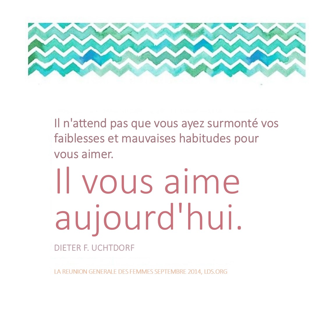Le président Uchtdorf a dit : « Dieu vous aime aujourd’hui et à jamais. Il n’attend pas que vous ayez surmonté vos faiblesses et vos mauvaises habitudes pour vous aimer. Il vous aime aujourd’hui avec une compréhension totale de vos épreuves. … Il est au courant de vos remords pour les fois où vous n’avez pas été à la hauteur ou avez échoué. Et il vous aime malgré cela. … Il veut que vous accomplissiez votre destinée, à savoir rentrer dans votre foyer céleste avec honneur. »