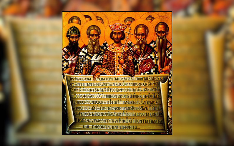 « Nous croyons en un seul Dieu, le Père tout-puissant, créateur de toutes choses visibles et invisibles, et en un seul Seigneur, Jésus-Christ, le Fils de Dieu, né du Père [le Fils unique, c’est-à-dire de l’essence du Père, Dieu de Dieu, Lumière de Lumière, vrai Dieu de vrai Dieu, engendré et non créé, étant d’une seule substance avec le Père, par qui toutes choses ont été faites [au ciel et sur la terre], qui pour nous les hommes et pour notre salut est descendu, s’est incarné et s’est fait homme, a souffert, est ressuscité le troisième jour, est monté au ciel, d’où il viendra juger les vivants et les morts, et dans le Saint-Esprit. »