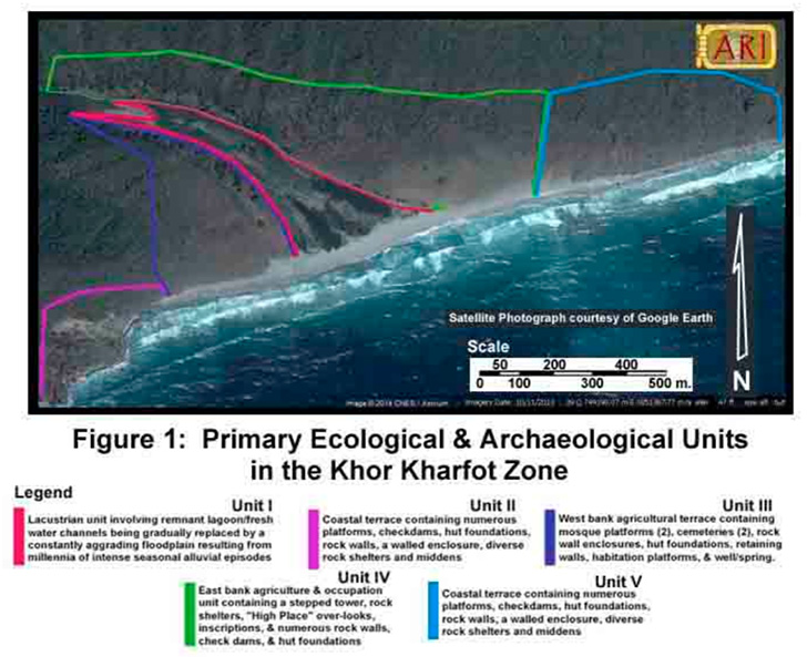 Voici une photo prise depuis les airs de Khor Kharfot, divisé en deux unités, écologique et archéologique. La zone sur la gauche, intitulée Unité 2, est l’endroit où se trouve le sanctuaire et semble être la zone d’habitation la plus ancienne sur le site.