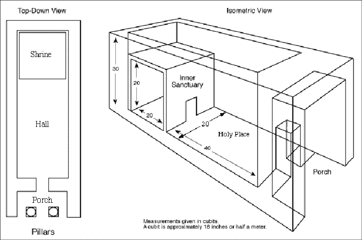 Ce temple a été construit selon une géométrie sacrée, donnée par le Seigneur (voir 1 Rois 6). La structure entière devait faire face à l’Est. Dans sa cour intérieure se trouvait un autel pour les sacrifices, où les animaux étaient brûlés, ainsi qu’une cuve d’airain où les prêtres se lavaient. Une entrée limitée (parfois appelé le premier voile) conduisait au Lieu Saint.