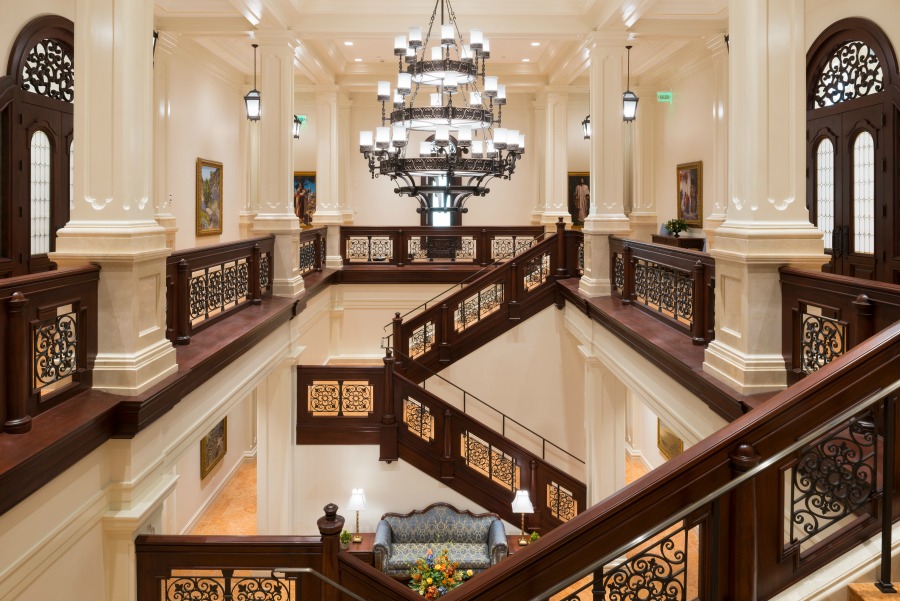 Certains temples sont construits sur un seul niveau. Et les autres possèdent des étages, où on retrouve principalement la salle céleste et les salles de scellement. Les escaliers et les rambardes sont parfois très impressionnants, comme celui-ci qui est dans le temple de Tijuana, au Mexique.
