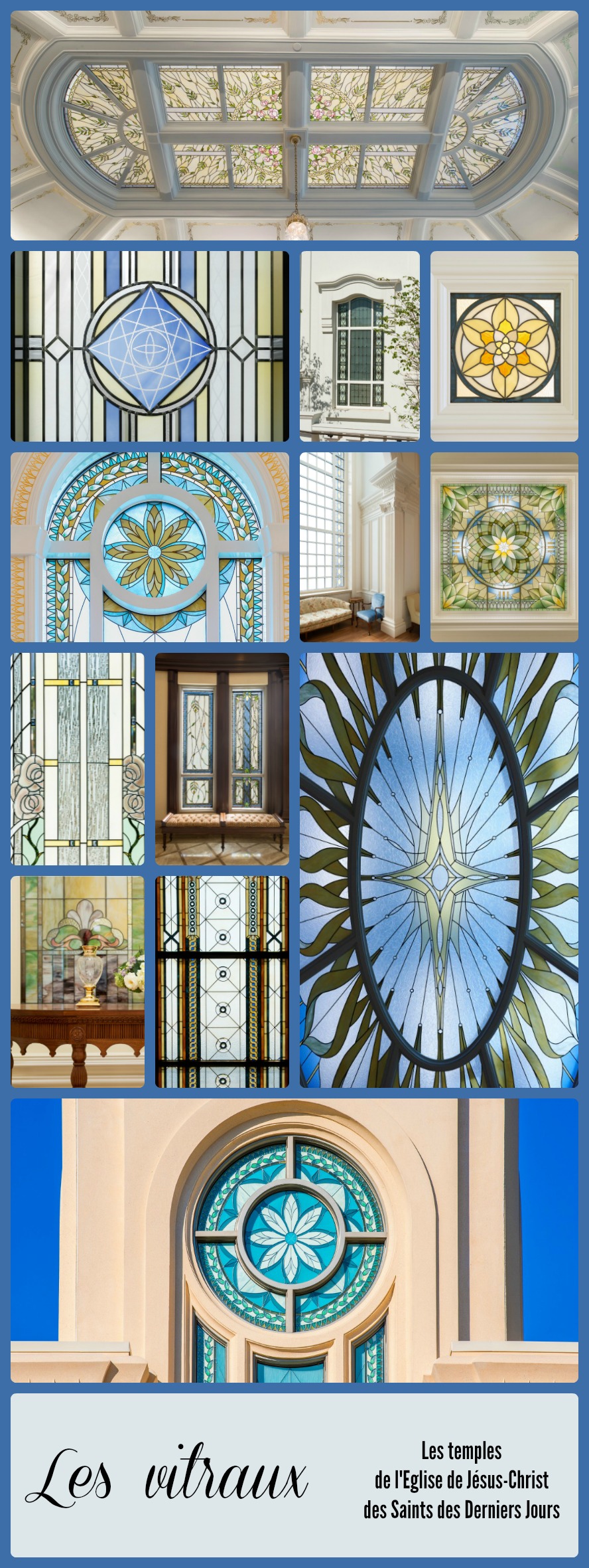 En tant que fenêtres, ou comme verrières, les vitraux sont présents dans tous les temples. Motifs floraux ou géométriques, symboles ou représentations figuratives, style moderne ou plus classique, chaque temple a des vitraux en accord avec son architecture et le style choisi par les architectes et les apôtres.