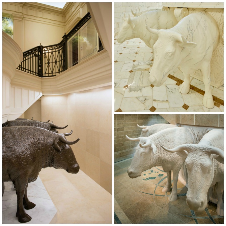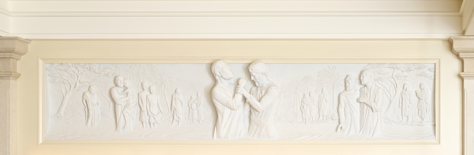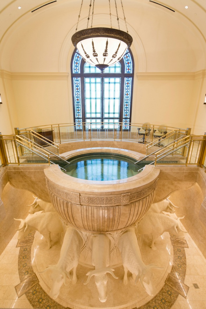 Jésus a enseigné le baptême dans la Bible (voir, par exemple, Jean 3:5). Comme de nombreuses personnes n’ont pas l’occasion de se faire baptiser sur terre, les fonts baptismaux des temples sont utilisés par les vivants qui se font baptiser en faveur des morts. Les fonts baptismaux sont posés sur le dos de douze bœufs selon une tradition qui remonte à l’époque du roi Salomon comme on peut le lire dans l’Ancien Testament. Les bœufs représentent les douze tribus de l’Israël des temps anciens.