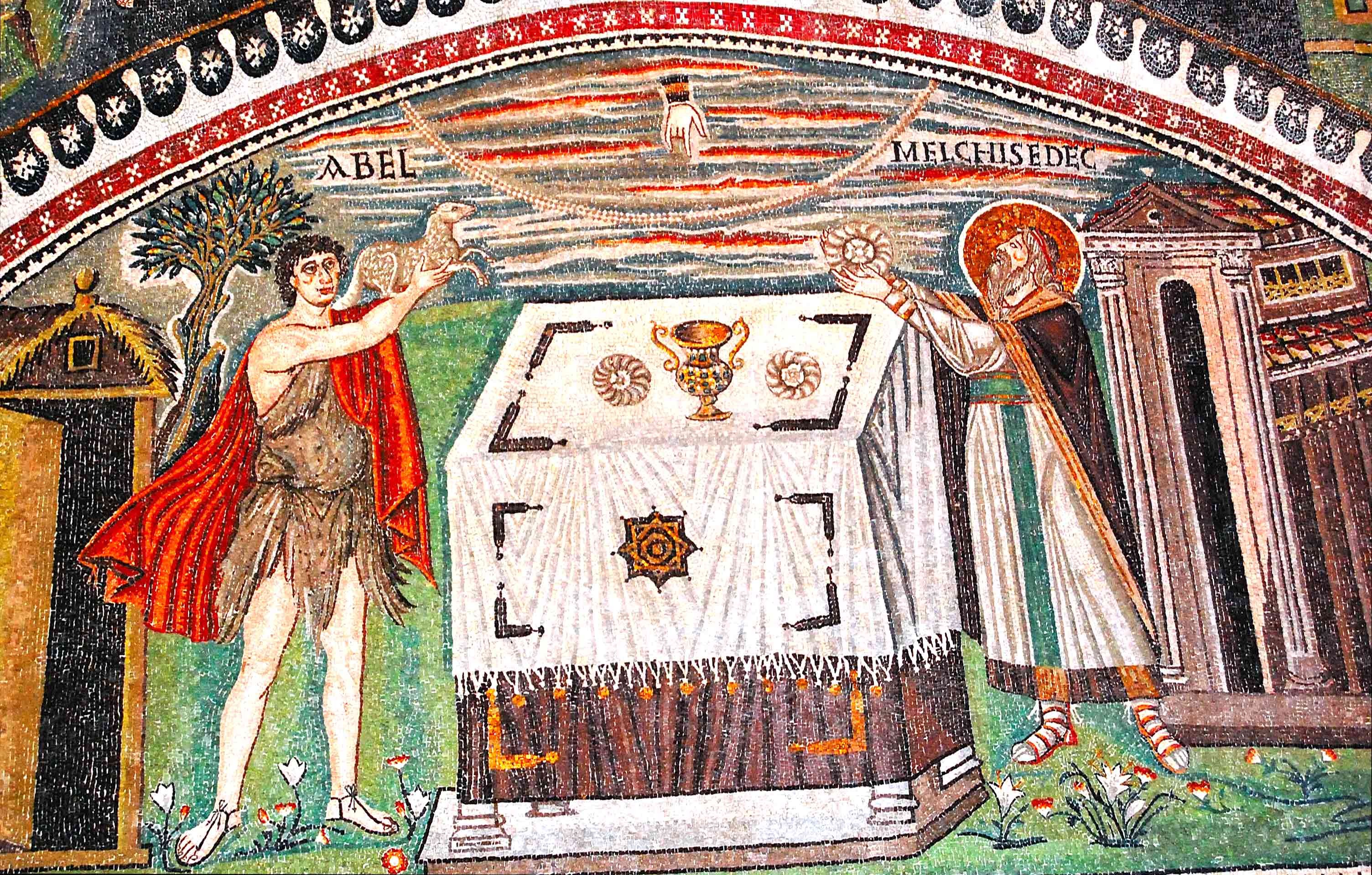 Nous pouvons remarquer un symbolisme du temple très intéressant et familier dans cette mosaïque créée relativement vite après le début de l’apostasie. Nous voyons des voiles, la main de Dieu se tendre depuis l’arrière du voile, et Melchisédek représenter le Christ et officier à l’autel. Le sceau de Melchisédek est placé à un endroit sacré traditionnel et caractérisé par les quatre signes à angle droit. Les signes en forme de L sont symboliques du bras levé à angle droit, ou en d’autres termes, symboliques d’une alliance.